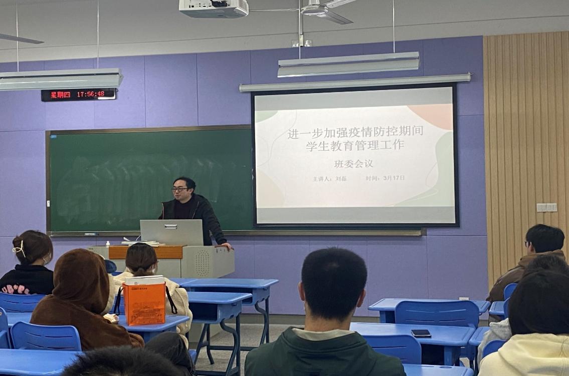 根据学校《关于进一步加强校园疫情防控工作的通知》《关于进一步加强校园疫情防控期间学生教育管理工作的通知》等文件精神,为进一步做好校园疫情防控期间学生教育管理工作,半岛官方端网页版于2022年3月17日下午在教2-304教室召开主题班委会议。本次会议由刘磊老师主持,各班班长、团支书、学习委员代表参加了会议。