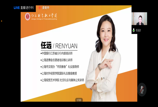 2022年5月11日下午,培训在腾讯会议如期进行,金融理财达人社团的同学们来到财商学院教学楼集体参加了会议。培训由江苏财会职业学校张维校长主持,主讲嘉宾为任远。任远老师是资深的银行礼仪专家,担任着中国银行江苏省分行内部培训师、上海进博会志愿者培训核心讲师、上海市文明办“市民修身”礼仪指导师、上海对外经贸学院国际礼仪客座教授、上海视学艺术学院社交礼仪与媒体公关讲师等职,她以“商业银行礼仪要领”为主题,从职业素养与服务意识、职业形象塑造、职业行为规范等方面展开讲授。