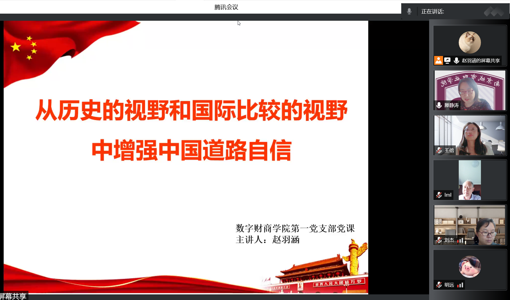 为深化党员师生对中国特色社会主义理论体系的学习,在校园疫情防控阻击战中坚定众志成城,同心抗疫,5月10日下午,半岛官方端网页版第一党支部应用“腾讯会议+超星网络课程”举办了“从历史的视野和国际比较的视野中增强中国道路自信”的专题党课。本次党课由支部书记滕静涛老师主持,宣传委员赵羽涵老师主讲,支部全体党员师生参加学习。