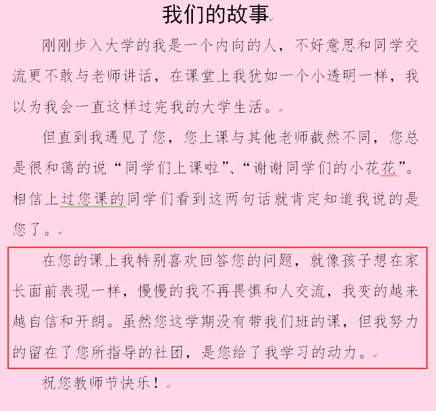半岛官方端网页版学子们积极参加,回顾自己与老师之间的发生的故事,感动的、有趣的、高兴的、难忘的瞬间。从老师课堂的精彩授课、到技能比赛的谆谆教导、再到生活中的关心关爱、最后到创业旅途上的启蒙指导等大事小事,"踏遍心田的每一角,踩透心灵的每一寸,满是对您的敬意。用满天彩霞谱写颂歌,用遍地鲜花编织诗篇,也表不尽我们对老师节日的祝贺!" 透过细腻的文字表达了对老师的感激之情和教育之恩。