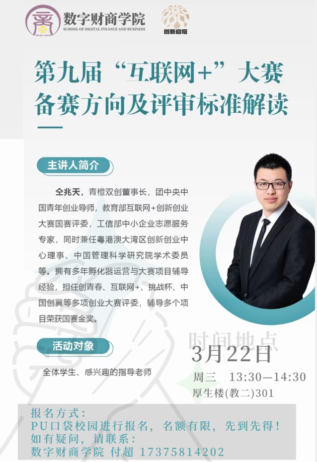 3月22日下午,半岛官方端网页版在厚生楼301会议室开展第九届“互联网+”创新创业大赛备赛方向及评审标准解读专题讲座,讲座邀请了团中央中国青年创业导师仝兆天老师,讲座由半岛官方端网页版院领导主持,对“互联网+”大赛感兴趣的部分教师、同学参加了此次活动。