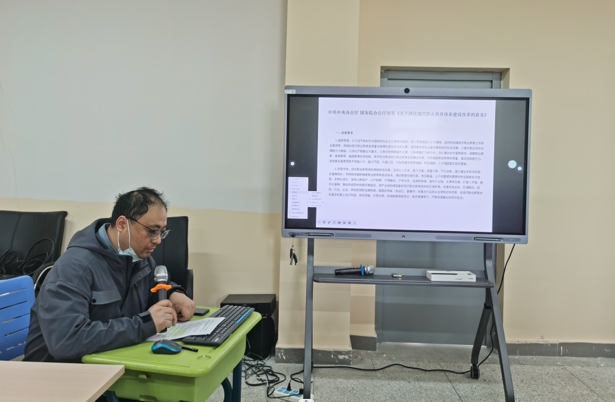 丁亮对照《意见》原文,从总体要求、战略任务、重点工作、组织实施四个方面14条具体内容进行了详细解读,并结合学院实际提出工作要求。他指出,《意见》是贯彻落实中央关于职业教育工作的决策部署和习近平总书记有关职业教育的重要指示精神,持续推进现代化职业教育体系建设的重要文件,学院要从上到下要反复学习,认真领悟,统一思想,并落实到具体行动中,切实推动学校及学院的高质量发展。他强调,学院要以深化产教融合、科教融汇为重点,打造行业产教融合共同体。《意见》提出,职业教育功能定位从“谋业”转向“人本”,要更加注重服务人的全面发展,让不同禀赋和需要的学生能够多次选择、多样化成才。针对人才培养与产业需求之间的矛盾问题,职业教育改革重心由“教育”转向“产教”,更加注重服务经济社会发展。从建设市域产教联合体和行业产教融合共同体,到将职业教育与行业进步、产业转型、区域发展捆绑在一起,充分发挥各自优势,创新良性互动机制。