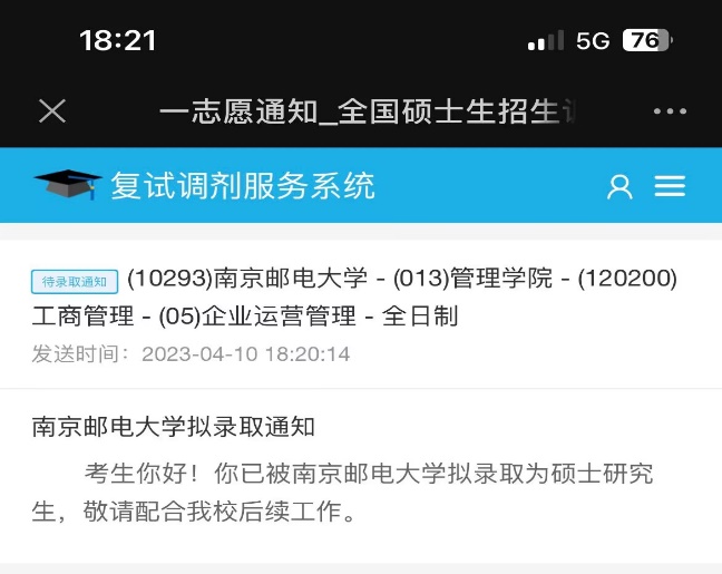 2023年4月11日深夜在2017级国际商务专业群中传来一则令人振奋的好消息:该班优秀毕业生蔡安琪同学以第一志愿被南京邮电大学工商管理专业录取为硕士研究生。喜讯传来全院师生纷纷点赞、送上祝福并为她感到自豪。