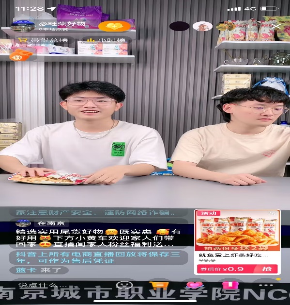4月18日中午,社团根据前期试播反馈,及时调整产品品类,在抖音平台开启了零食直播实践。在校企老师的指导下,两位主播准备充分,精神饱满,顺利完成本场直播,得到了学院全体师生的转发和点赞。