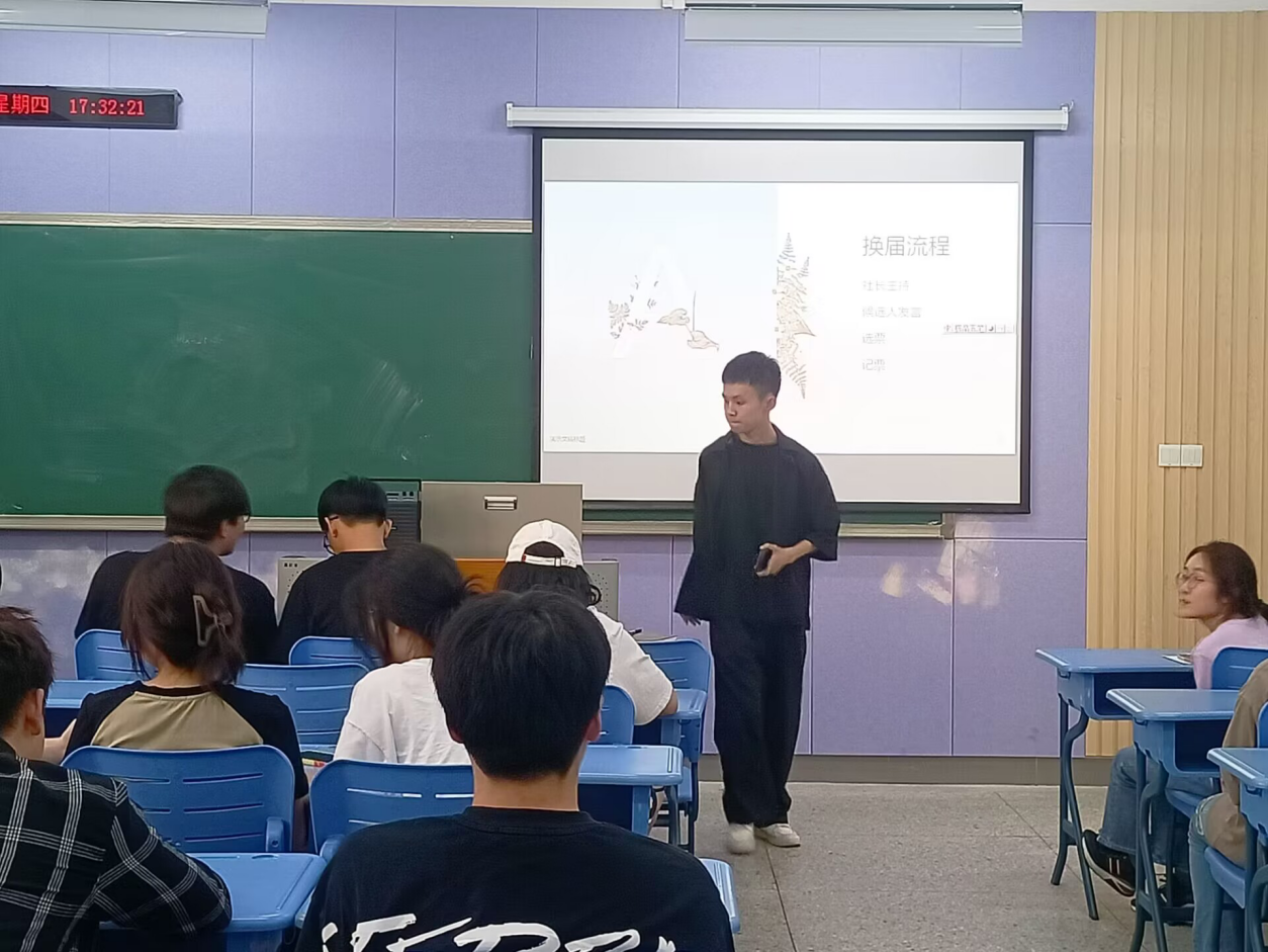 首先,社长姜观杭对过去一年的社团工作情况作了总结,对社团近期换届准备工作进行了说明,重点强调了换届大会的流程,包括竞选人答辩、唱票等。紧接着,参与换届竞选的同学依次上台发表竞选,随后社团成员投票,最后社团指导老师总结发言,并对新一届社团干部提出了寄语和希望。