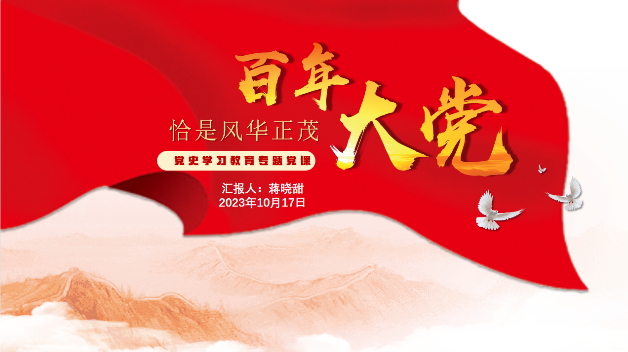 本次党课围绕“百年大党,恰是风华正茂”主题开展,蒋晓甜就中国共产党的成立、中国共产党的百年求索、党史百年发展伟大意义以及新时代党员建设新要求进行详细讲述。党的成立初期,风云巨变,经历重重困难与考验。在中国共产党的领导下,从石库门到天安门,从兴业路到复兴路,一艘小小红船承载着人民的重托、民族的希望,越过急流险滩,穿过惊涛骇浪,成为领航中国行稳致远的巍巍巨轮,迎来了中国今天的繁荣与富强。“百年恰是风华正茂”,百年来波澜壮阔的历史进程,验证了一个光辉的结论:“中国共产党是一个伟大、光荣、正确的党”,没有共产党就没有新中国,只有中国共产党才能发展中国,才能够团结带领中华儿女实现伟大复兴的中国梦。
