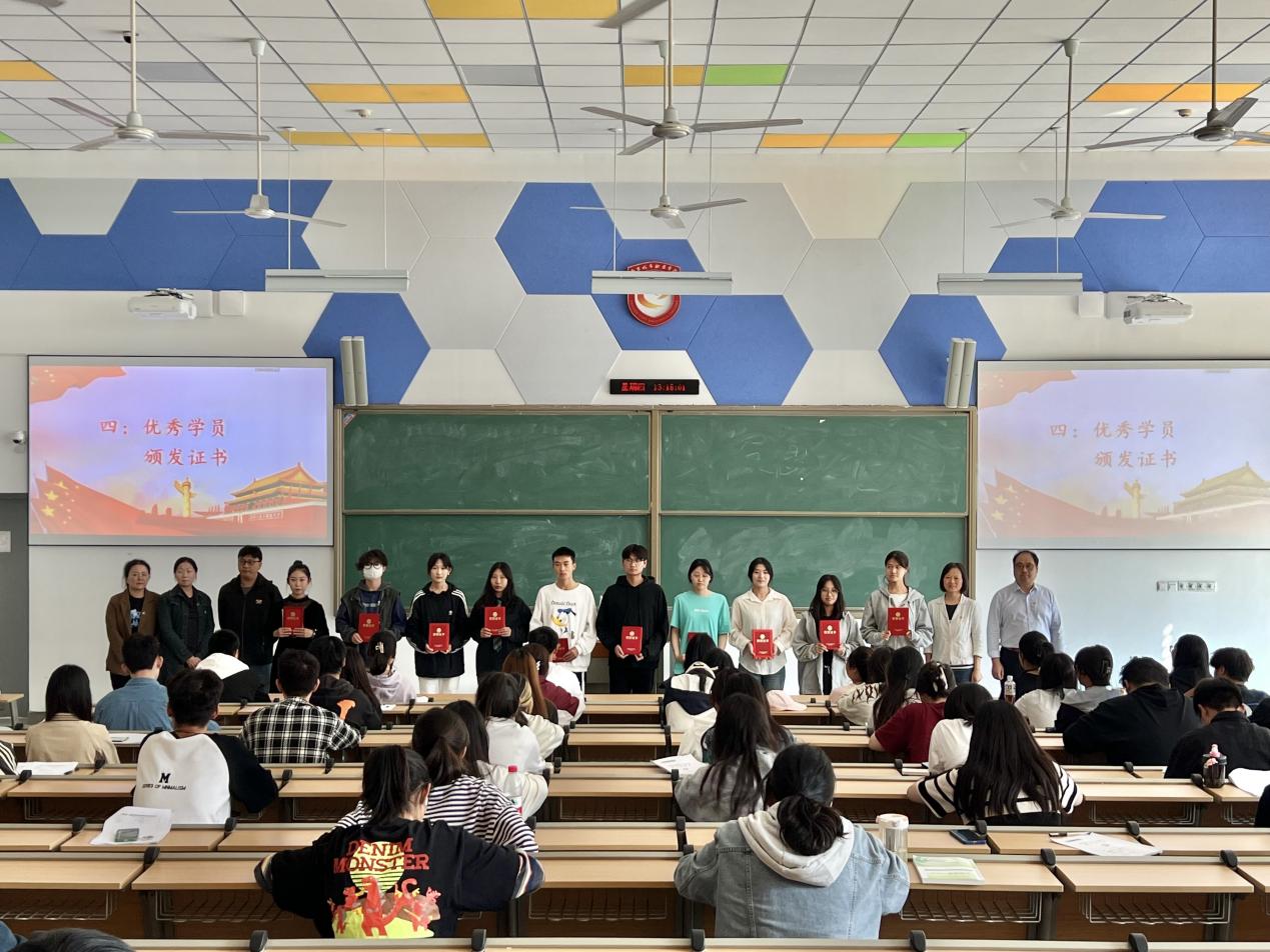 第三项议程优秀学员代表发言,来自23级网络营销与直播电商1班的优秀学员代表高静同学与大家分享了在党课学习过程中的所学、所思、所想。她表示通过党课不仅学习了党的发展历程,更让自己更加坚定了为党、为人民、为共产主义事业奋斗终生的决心和信念。她表示今后将更加认真学习这些科学理论,努力做到不仅在思想上入党,更要尽自己的所能去帮助他人,会时刻以党员的要求来要求自己,不断完善自己。第四项议程,优秀学员表彰,宣读了在本次党课学习期间涌现出的十位优秀学员名单,颁发优秀学员证书并合影留念。