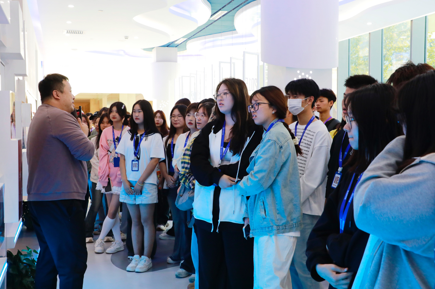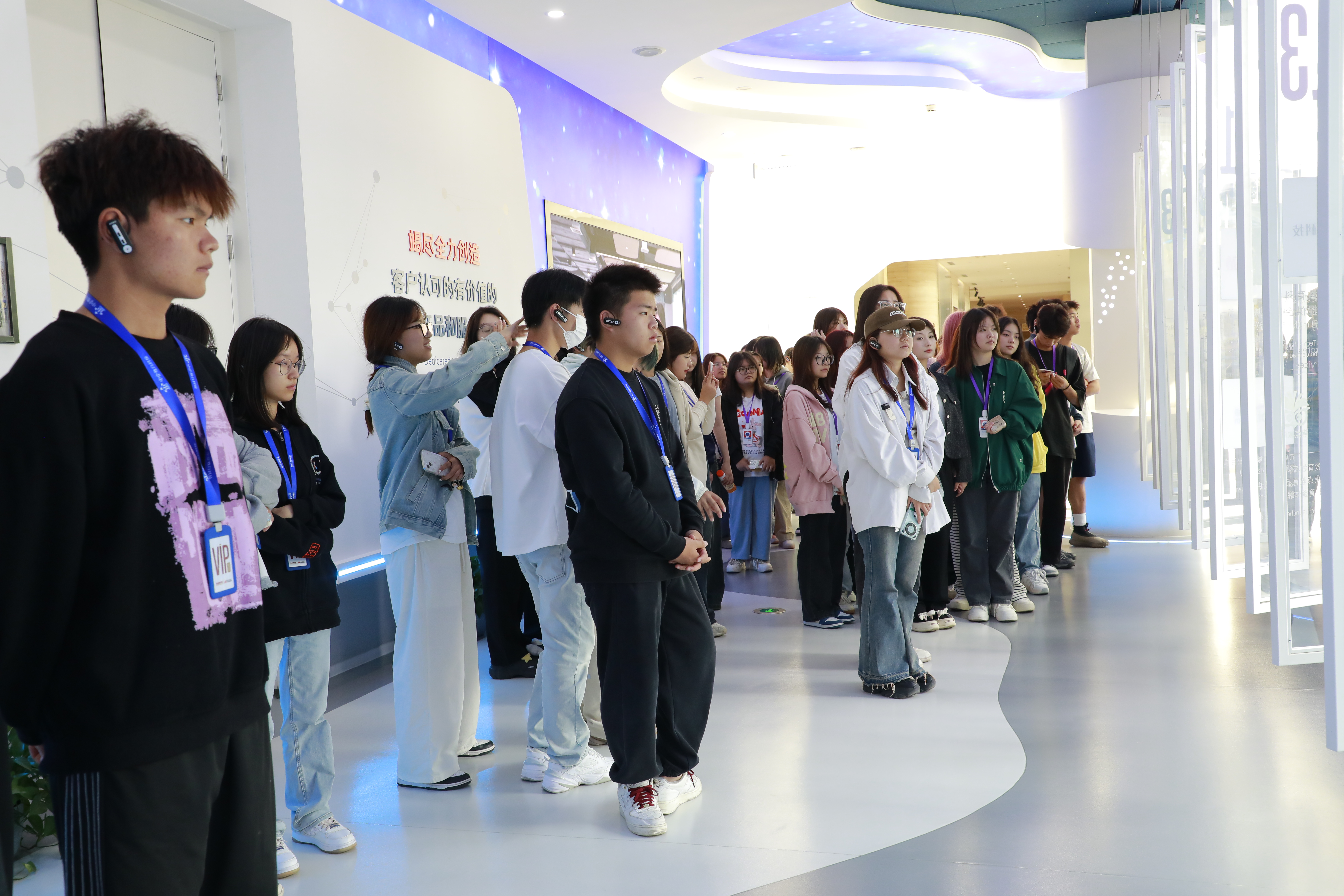 参观从公司的大厅开始,为了提供更好的体验,公司专门为同学们准备了工牌和便携式蓝牙耳机,极大提高了同学们对参观的享受感。杨老师首先介绍大厅的天花板,整个天花板呈宇宙星空版图,寓意着焦点公司会包揽宇宙,如同繁星般冉冉升起,闪闪发光然后遍布全球。随后又向同学们介绍了公司的吉祥物——焦小糖。焦小糖作为吉祥物,被放在了公司进门最显眼的地方,为进入公司的每一名员工或者参观者带来每一天的好运。同样,焦小糖的形象也会随着年份而改变,今年焦小糖就化身了焦兔兔来陪伴大家,为大家带来欢乐。