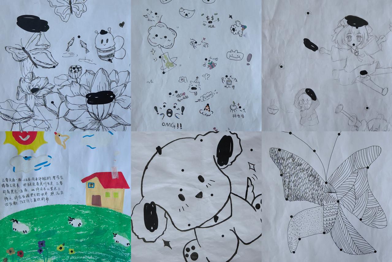 本次活动精心准备了100份独特的素材——印有大小形态各异的黑点图案的白色纸张。参与活动的同学们将随机抽取一张纸张,以这些黑点为基础,运用无限的想象与创造力,将原本带有“瑕疵”的白纸,转变为一件件充满美感与特色的艺术作品。他们或以黑点为轮廓,创作出一只蝴蝶或一株花朵;或以黑点为五官,创作的表情包和小动物生动有趣;或以黑点为墨迹,勾勒出富有意蕴的画卷。在他们的巧手之下,原本平凡无奇的白纸焕发出独特的光彩。本次活动共计评选出20份优秀作品进行展示。