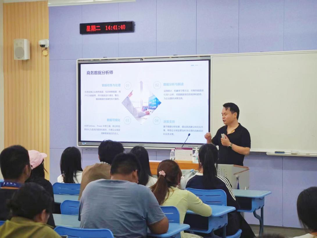 接着,张老师为同学们详细介绍了商务数据分析与应用专业的背景、职业面向、课程设置及培养方案等内容,让同学们认识到随着大数据时代的到来,商务数据分析已成为企业决策的重要支撑,该专业致力于培养具备扎实理论基础和实践能力的复合型人才。