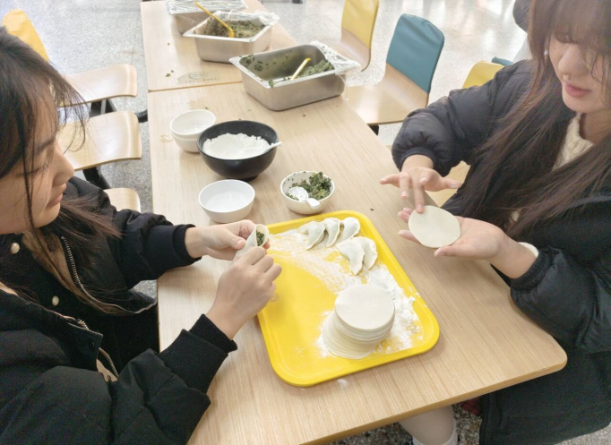 活动当日下午,食堂内热闹非凡,处处洋溢着节日的喜庆氛围。工作人员提前准备好饺子皮、馅料等食材,整齐排列在桌面上,仿佛在静静等待一场文化与欢乐的交融。同学们陆续抵达食堂,热情瞬间被点燃,迅速分组,挽起袖子,准备在这场美食盛宴中大展身手。活动现场,同学们各展神通。熟练的同学手法娴熟,拿起饺子皮,精准填上馅料,双手如行云流水般翻飞,转眼间,一个个精致饱满的饺子便在桌上整齐列队;初次尝试的同学也毫不气馁,认真学习每一个步骤,努力包出人生中的第一个饺子。尽管这些饺子形状各异,但每一个都饱含着同学们满满的心意。大家在包饺子的过程中,热烈交流着家乡冬至的习俗,南北方的文化在这里碰撞、交融,欢声笑语回荡在食堂的每一个角落,浓浓的温情弥漫开来。