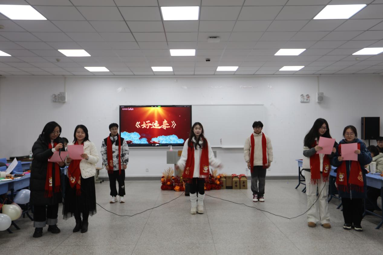 活动伊始,商数专业教师以一首《好运从四面八方来》的合唱点燃现场气氛,嘹亮歌声传递着对新年的美好期许,展现出教师团队的蓬勃朝气。随后,学生代表带来的朗诵《闪耀吧,青春的火光》,用激昂文字与饱满情感抒发青春梦想,彰显学子积极向上的精神风貌。曹望老师的吉他独奏《花儿为什么这样红》,指尖灵动,弦音悠扬,令观众沉醉于经典旋律之中。