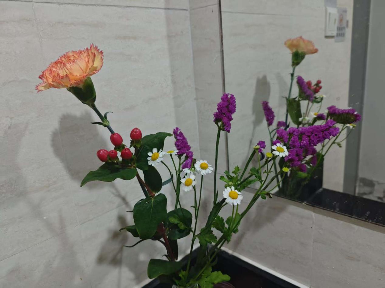 随着各色花材分发至桌案,活动进入白热化。百合、康乃馨、月季与满天星铺陈出缤纷的画卷,剪刀的轻响与欢快的讨论声交织成独特的乐章。A栋219宿舍的女生们将雏菊点缀在尤加利叶间,戏称这是“清新学霸风”;男生宿舍则大胆尝试撞色搭配,橙红色非洲菊与深蓝绣球碰撞出“热血兄弟情”。辅导员穿梭其间,时而俯身指导插花技巧,时而用手机记录下创意迸发的瞬间。“原来他审美这么在线!”一位男生看着室友精心修剪的韩式花束惊呼,引得全场欢笑。在协作插花的过程中,同学们不仅增进了友谊,还学会了如何在团队中发挥自己的优势,共同创造美好的作品。