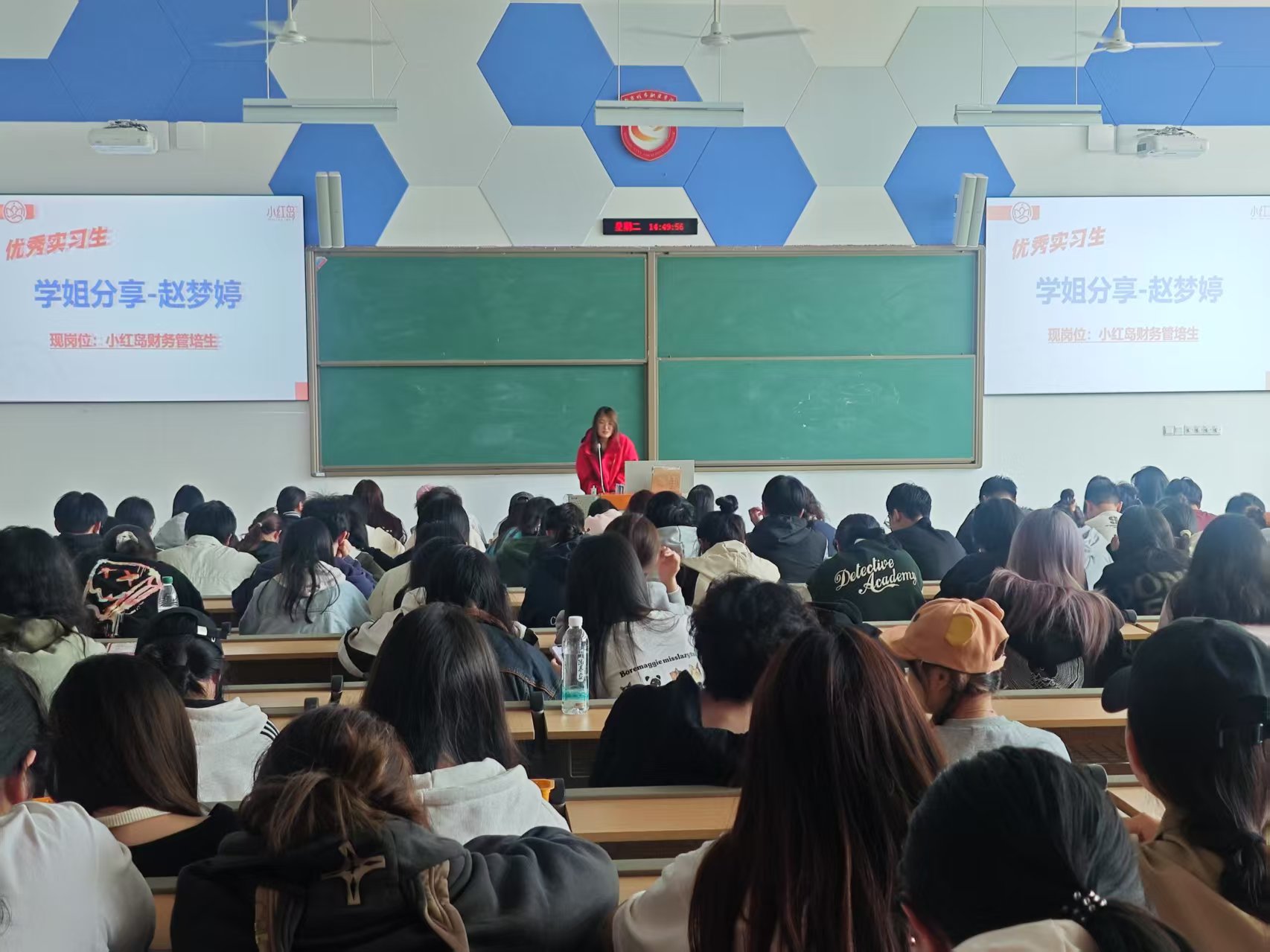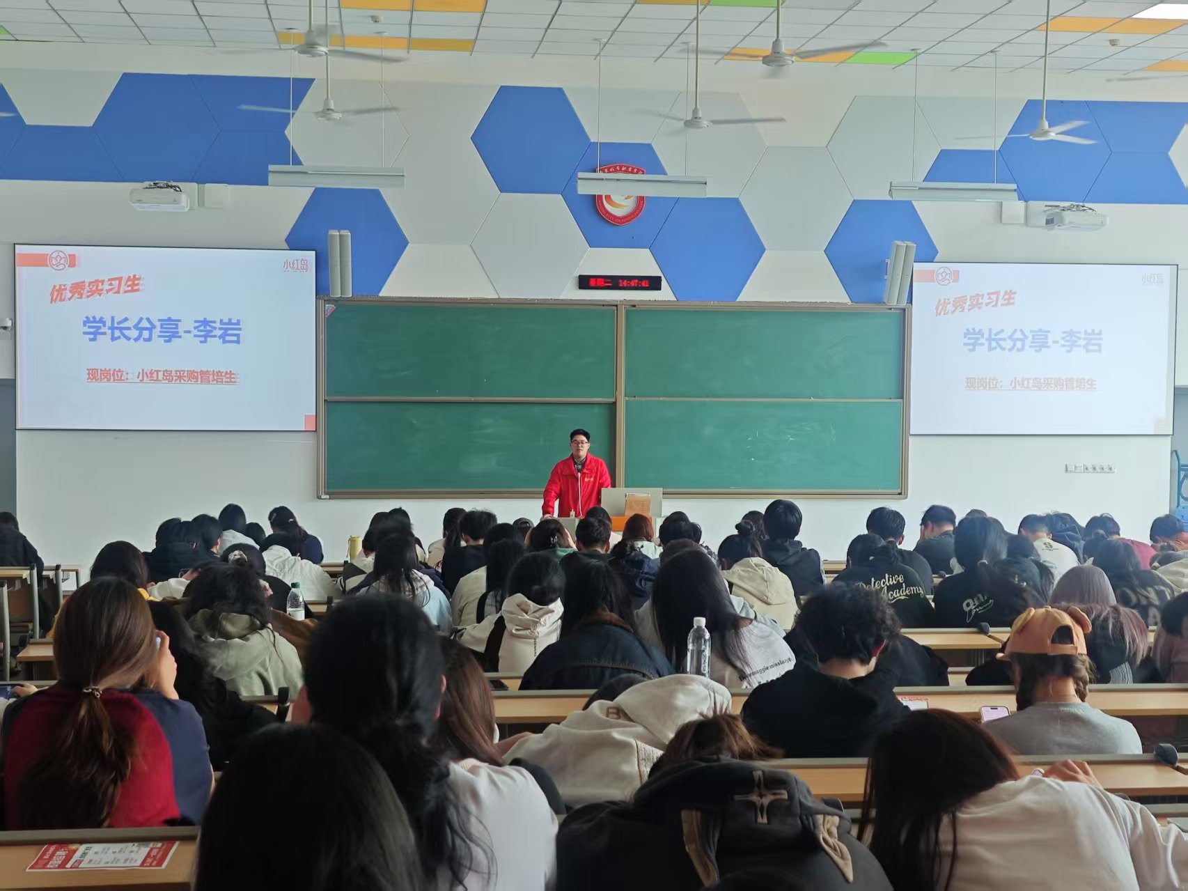 2025 年 4 月 22 日下午,半岛官方端网页版在厚生楼 101 成功举办了一场主题鲜明、内容充实的优秀毕业生就业分享会。本次分享会特邀我院 2022 级大数据与会计专业优秀学生李岩和赵梦婷作为主讲人,他俩目前就职于南京小红岛超市,并在工作中取得了不俗的成绩,此次回校与我院 2023 级全体专业 390 名学生分享就业经验。