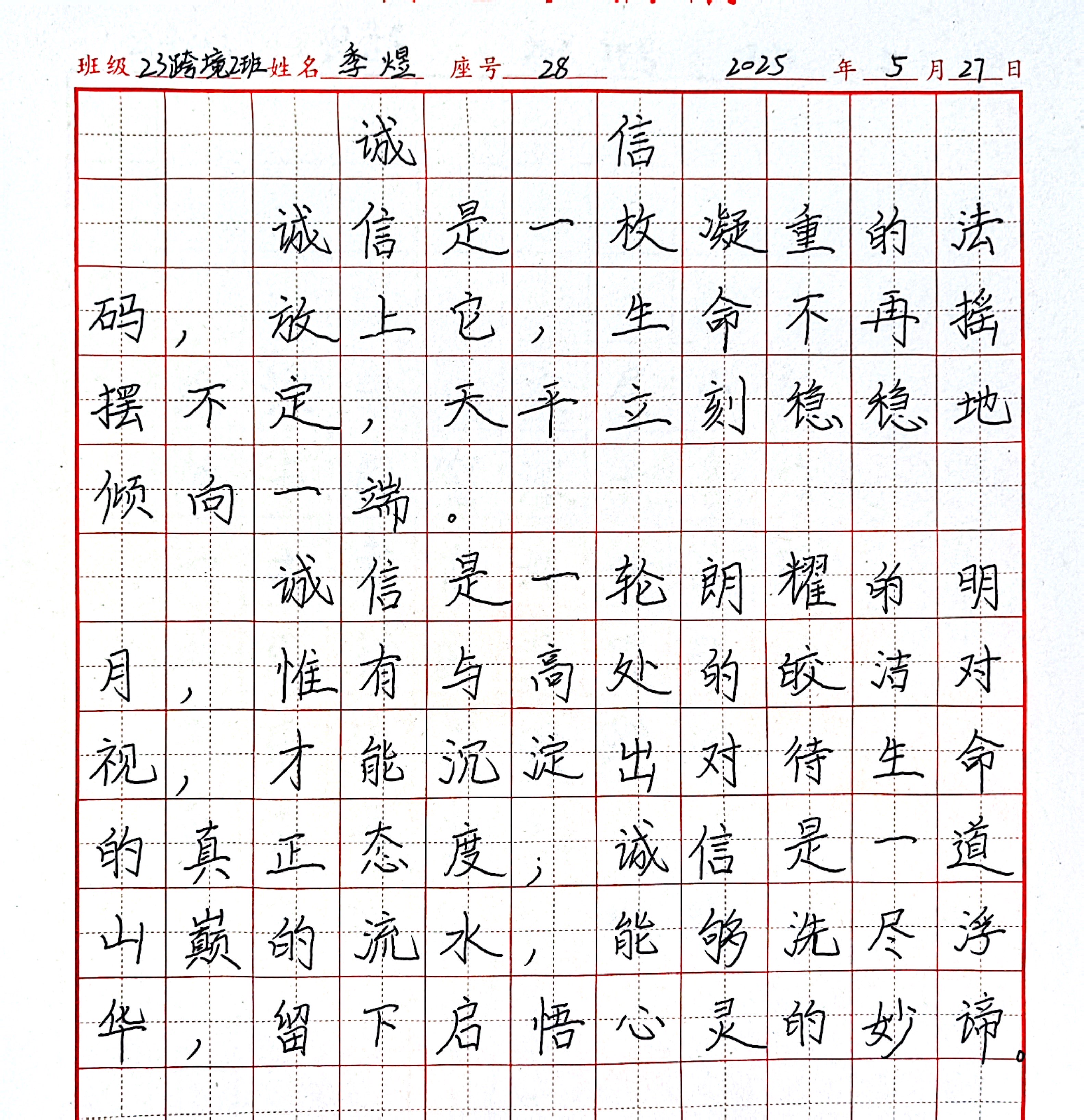 书写现场仅能听见笔尖与纸张摩挲的细微声响,选手们全神贯注,以笔为媒围绕主题各展其长,书写经典选段及原创诚信主题诗文。擅长行书者,运笔流畅,笔画呼应灵动,融诗词与书法之美;偏好隶书者,起收笔尽显“蚕头燕尾”,笔画舒展,展古文字典雅;选择楷书者,一丝不苟,精准把握笔画长短间距,字体规整,含传统书法神韵。每位选手沉浸于创作中,抒发对书法艺术的热爱,笔下的汉字或苍劲有力、或清秀工整、或灵动娟秀,尽显笔墨魅力,生动诠释中华优秀传统文化魅力,诚信之道的真谛。