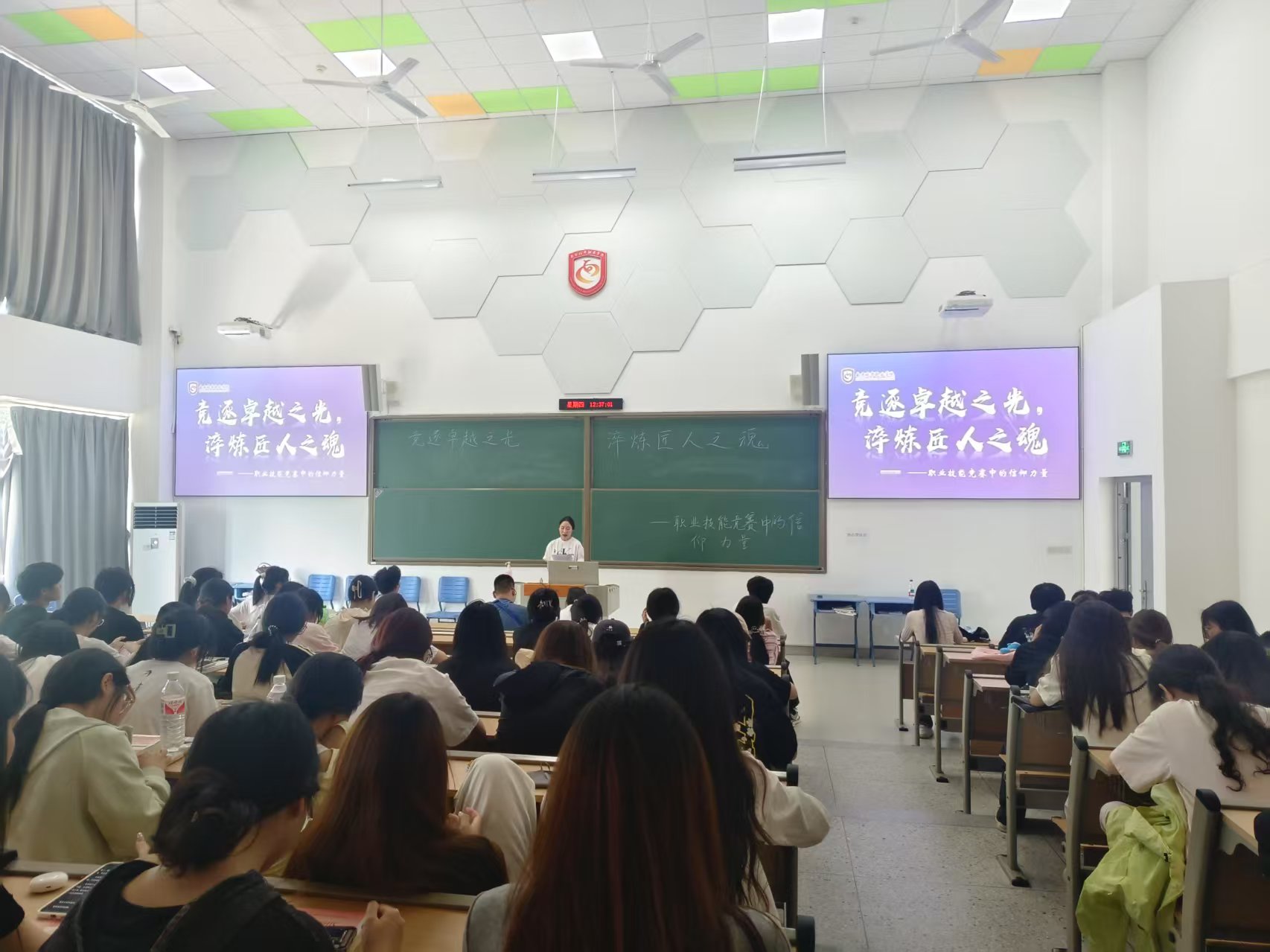 活动伊始,一场别开生面的知识问答环节迅速点燃了现场的气氛。同学们积极参与,通过快速抢答,不仅回顾了职业技能的基础理论,更在实践中深化了对专业知识的理解与掌握。这一环节不仅提升了大家的专业素养,更在轻松愉快的氛围中,激发了同学们对职业技能竞赛的浓厚兴趣与无限憧憬。随后,主持人对在职业技能竞赛中取得优异成绩的四位获奖学生进行了隆重介绍与表彰。他们分别来自不同的专业领域,却都以扎实的专业功底和不懈地追求卓越的精神,在各自的领域中熠熠生辉。他们的成功,是对“匠心”二字最生动的诠释,也是对所有学子的一次深刻激励。