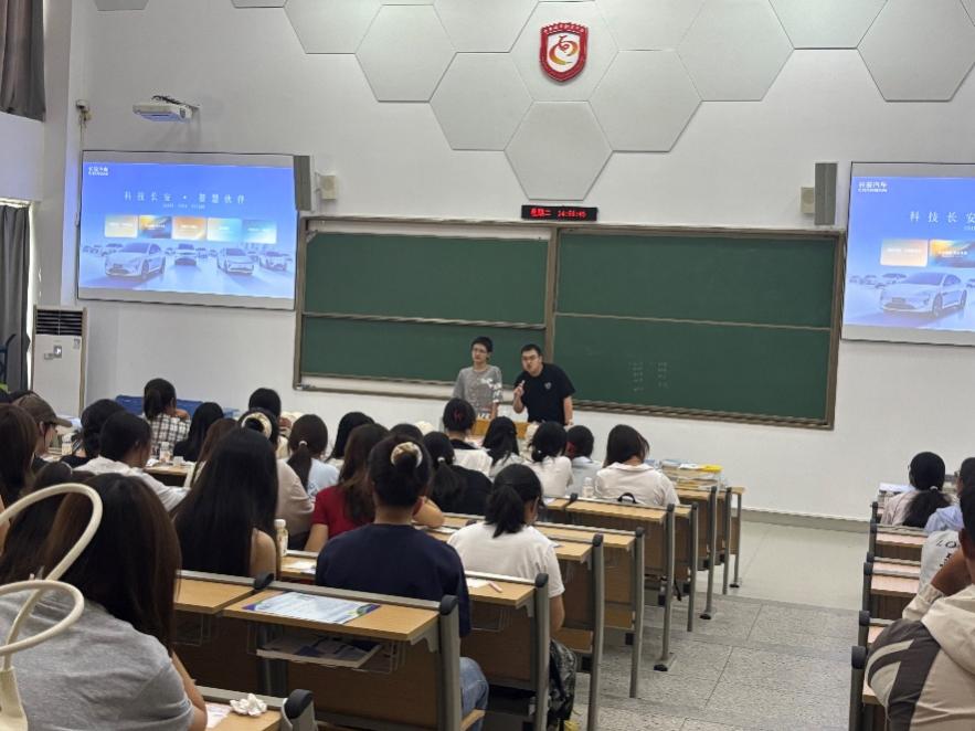 为帮助新生零距离感知行业动态,本次大会特邀了知名企业南京长安汽车有限公司团委副书记、长安汽车高级讲师陈松伯作为企业专家进行宣讲。陈副书记给大家介绍了长安汽车的发展历史,又结合自身多年做直播和短视频的经验,分享了直播电商领域的最新玩法、企业用人标准以及对人才能力的核心要求,并鼓励同学们:“这个行业充满机遇,但也需要极强的学习能力和抗压能力。希望你们在校期间不仅要学好理论,更要勇于实践,敢于试错,在真实的项目中锤炼真本领。”陈副书记的分享高屋建瓴又接地气,赢得了在场学生的阵阵掌声。