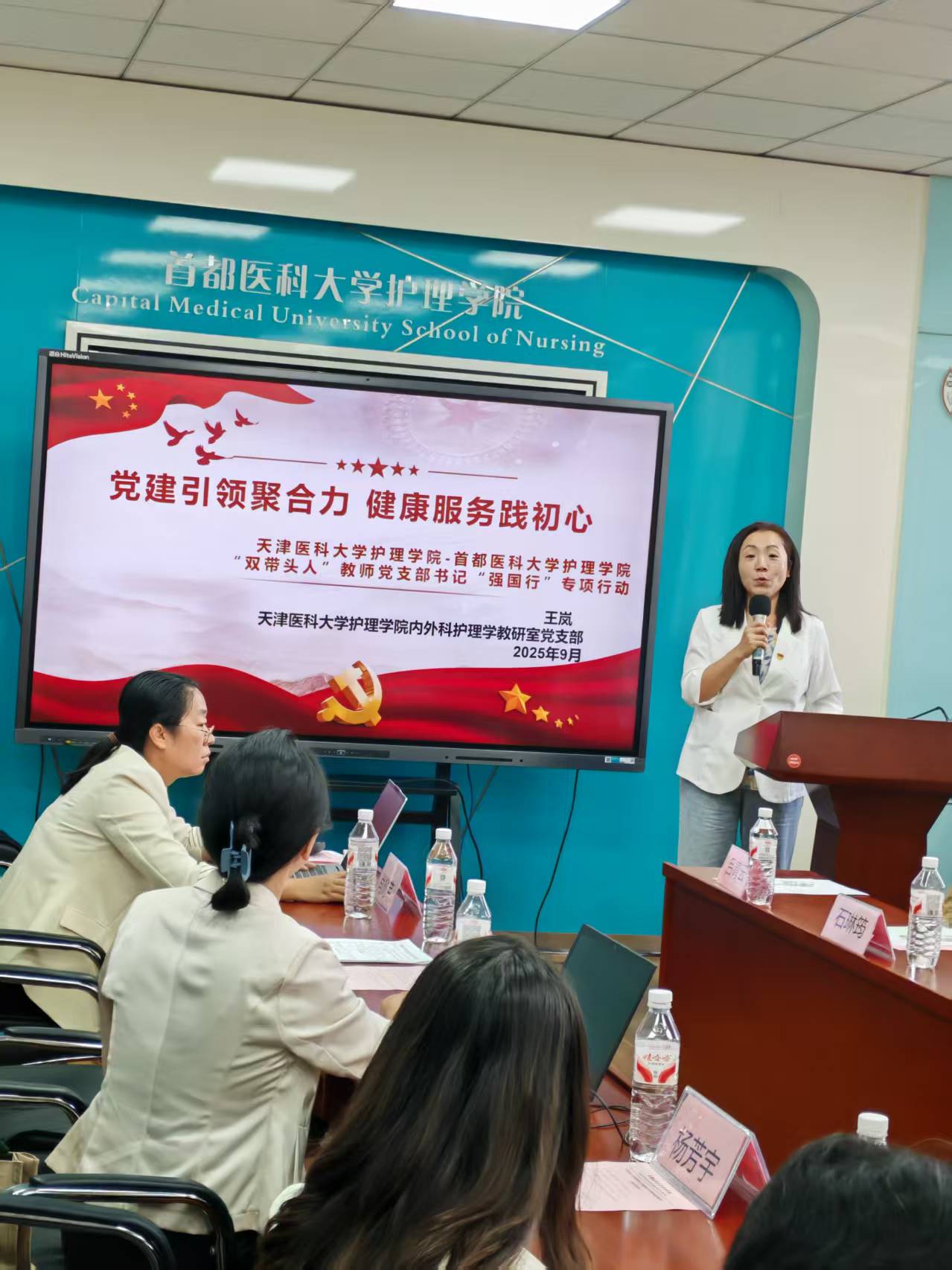 随后,天津医科大学半岛官方端网页版院长臧小英分享了天医半岛官方端网页版的概况、发展沿革和学生培养的宝贵经验,展现了其深厚的办学底蕴和育人成效。在党建与业务深度融合的专题研讨环节,天津医科大学半岛官方端网页版内外科教研室党支部书记王岚与首都医科大学半岛官方端网页版基护学系党支部书记刘溢思,围绕“双带头人”教师党支部书记“强国行”专项行动主题,分别分享了各自支部在强化思想建设、落实价值引领、推动学科发展、投身社会服务等方面的创新实践与显著成效,为双方如何将党建“软实力”转化为发展“硬支撑”提供了有益借鉴。